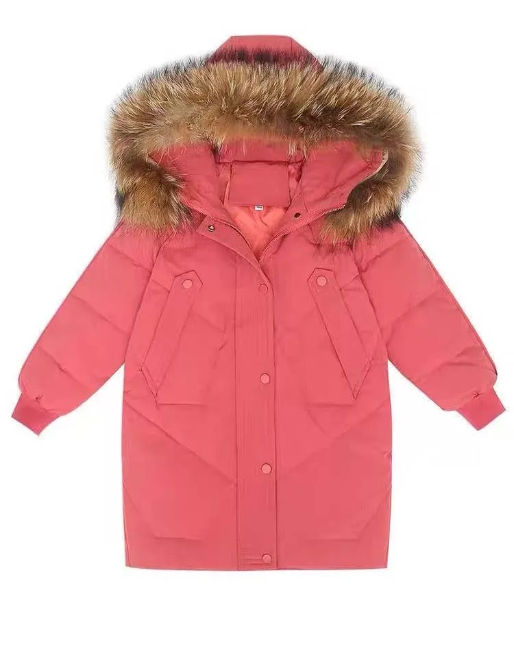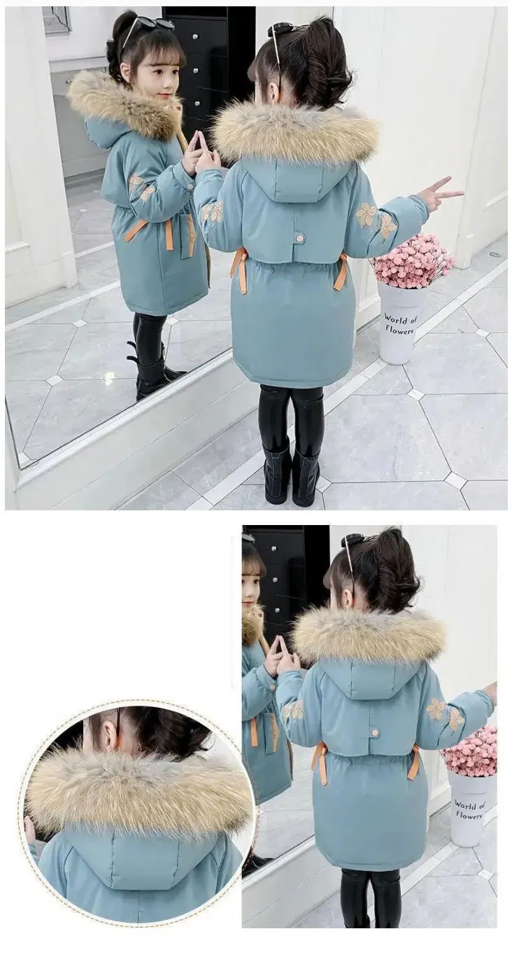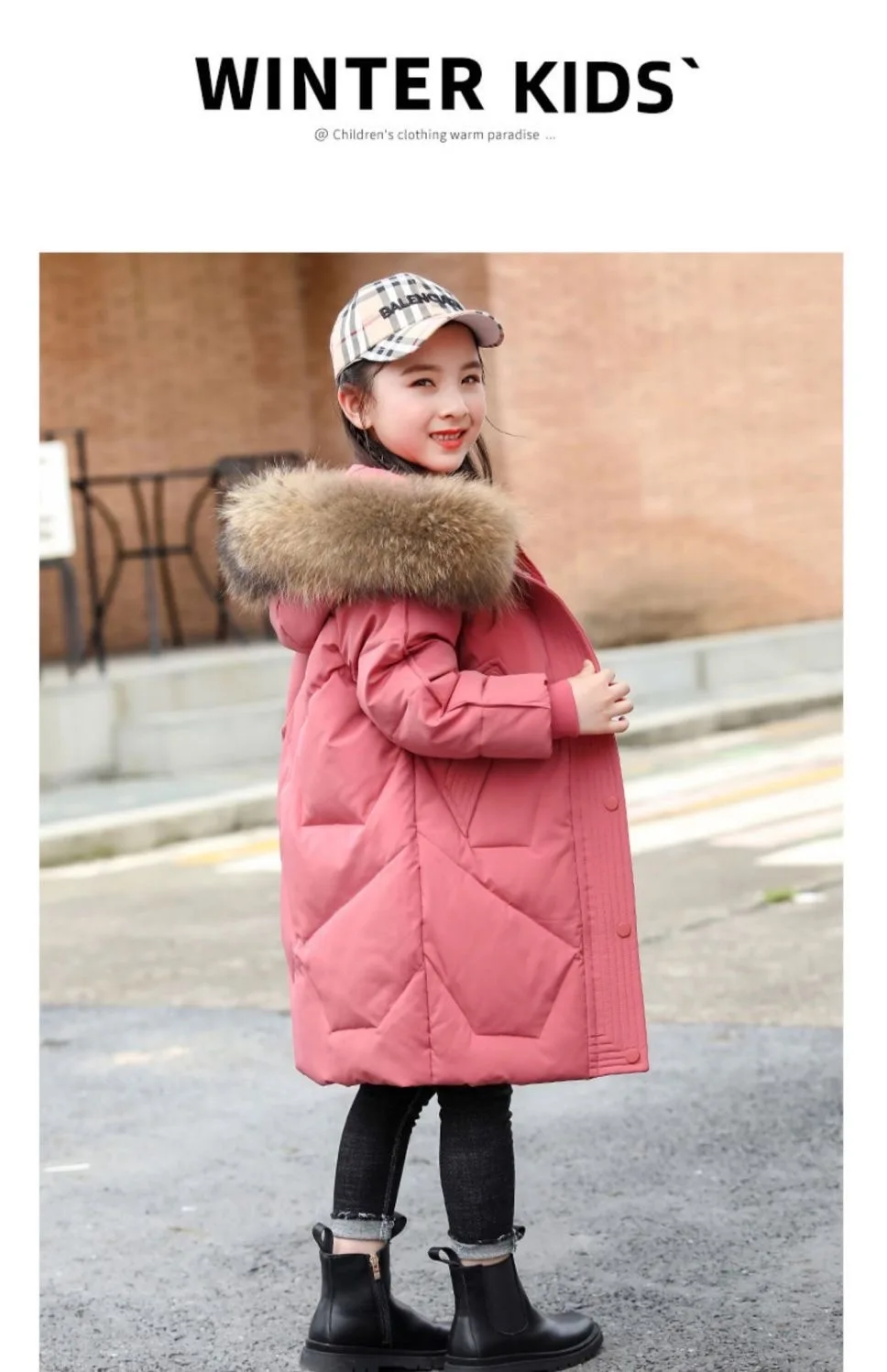 Winter Warm Jackets for Girls Two Colors Faux Fur Hooded Coat Kids White Duck Down Parkas Children Cotton Long Outwear